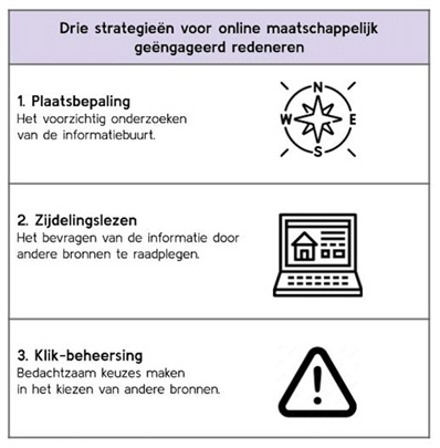 De laatste jaren bent u bezig om deze kritische manier van kijken naar bronnen om te zetten in een manier die ook online werkt. Hiervoor heeft u, samen met de collega’s van de SHEG, drie essentiële strategieën ontwikkeld zodat studenten beter uitgerust zijn om informatie online te benaderen (zie afbeelding 1). Hoe bent u tot deze drie strategieën gekomen?