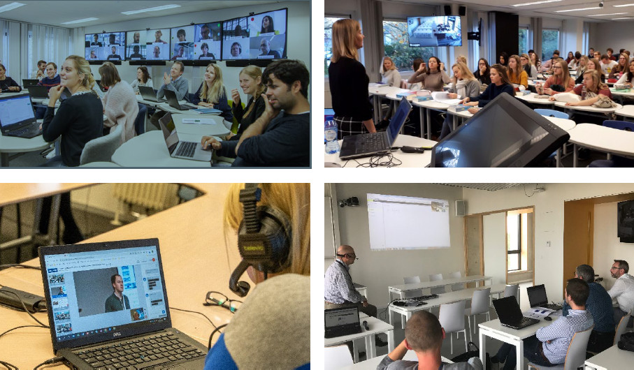 Figuur 1. Multilocatieleren georganiseerd binnen de hybrid virtual classroom (links) en de remote classroom (rechts)@ KU Leuven, campus Kulak Kortrijk