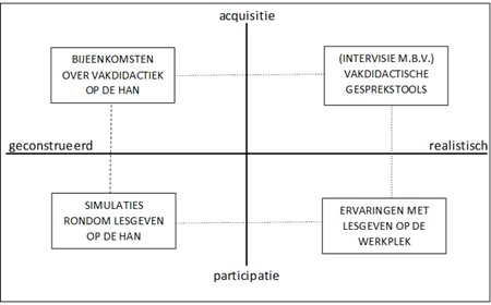 Dit betreft het kwadrant linksboven in het model. Studenten leren door de kennis te acquireren in de geconstrueerde omgeving. In bijeenkomsten op de HAN kan ook worden geleerd via simulaties. Studenten oefenen met lesgeven door bijvoorbeeld minilessen te geven aan elkaar. Dat vindt plaats linksonder in het model in een geconstrueerde omgeving waarin studenten participeren. Tijdens het werkplekleren doen studenten ervaringen op in de scholen in de regio. Dit betreft het kwadrant rechtsonder in het model. Zij leren dan door te participeren in een realistische omgeving. Om te voorkomen dat studenten een ‘gat’ ervaren tussen wat er in de theorie (linksboven) over vakdidactiek wordt geleerd en in de praktijk (rechtsonder) wordt toegepast, is het van belang leeractiviteiten en/of ondersteuning te ontwerpen die deze werelden aan elkaar verbinden. Door met studenten aan de hand van deze tool een gesprek te voeren over hun vakdidactische ontwikkeling of het structureel vanuit een begeleidingsrol voor- en nabespreken van hun lessen, acquireren deze leraren-in-opleiding kennis vanuit hun ervaringen in een realistische context. Als zodanig positioneren wij deze gesprekstools dan ook in de rechterbovenhoek van het model van hybride leeromgevingen (Zitter & Hoeve, 2012