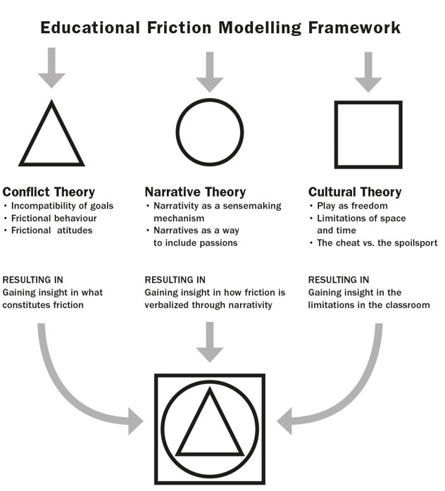 In ons model is een driehoek opgenomen in een cirkel en die staan beide weer in een vierkant. De driehoek staat voor frictie die is gebaseerd op inzichten uit conflictstudies. Volgens deze inzichten bestaat conflict uit drie componenten, de drie hoeken van de driehoek: